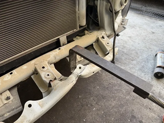 まずはフロントバンパーを取り外してクロスメンバーがかなり曲がっていたのである程度まで簡易修理。