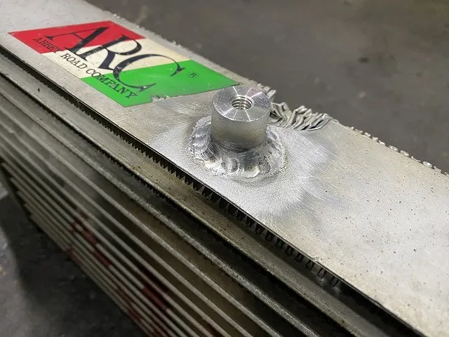 お客様がDIYでインタークーラーを取付するのに固定するアルミ製のボスを溶接してほしいというご依頼です。