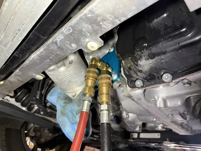 BMWのこのモデルは水冷オイルクーラーに専用のアタッチメントを取り付けないとATFの圧送交換ができません。
