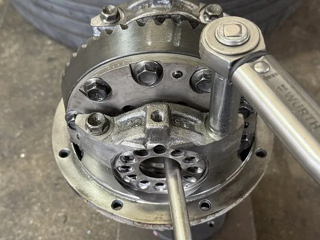 LSDのサイドベアリングを油圧プレス機で圧入し、リングギヤを規定トルクで締め付け。