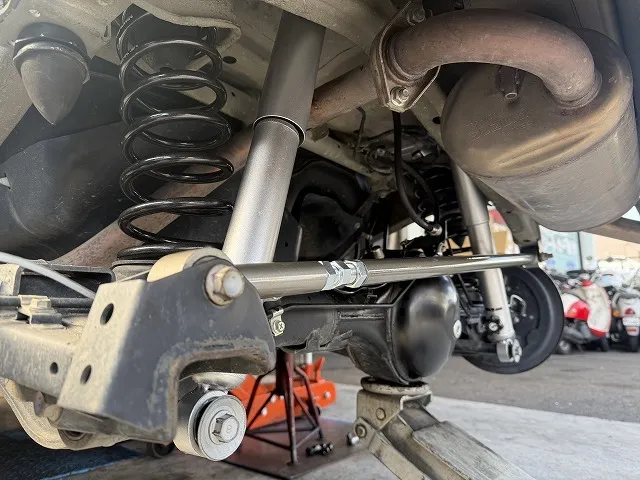 リフトアップパーツ取り付け後はラテラルロッドの調整とフロントのトー調整を実施。