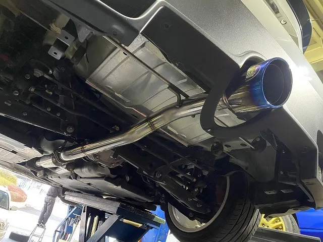 まずは今まで装着されていた車検対応マフラーを取り外す作業から。