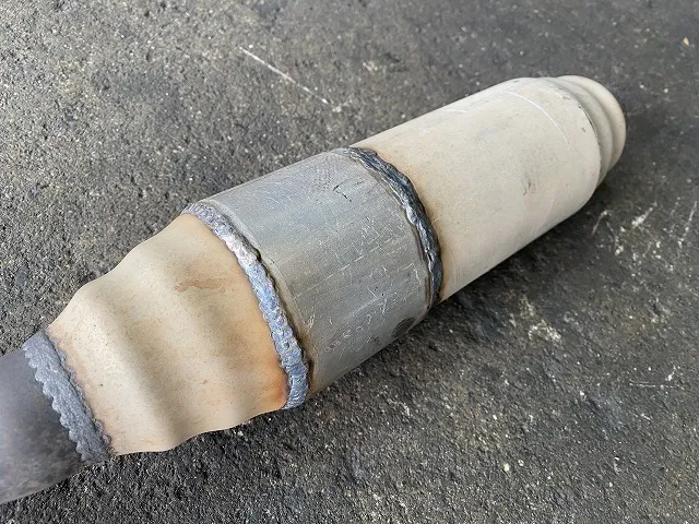 穴が空いた所にマフラーパイプをカットした部材をかぶせて修理していきます。