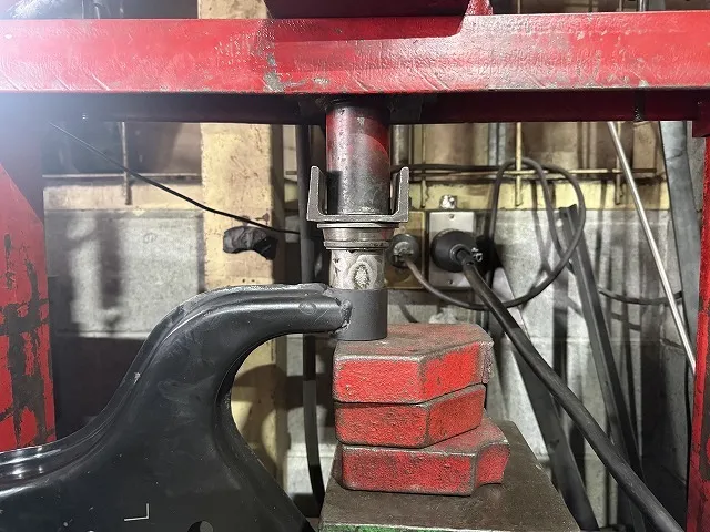 抜けたブッシュを取り外して油圧プレス機で新品ブッシュを圧入。